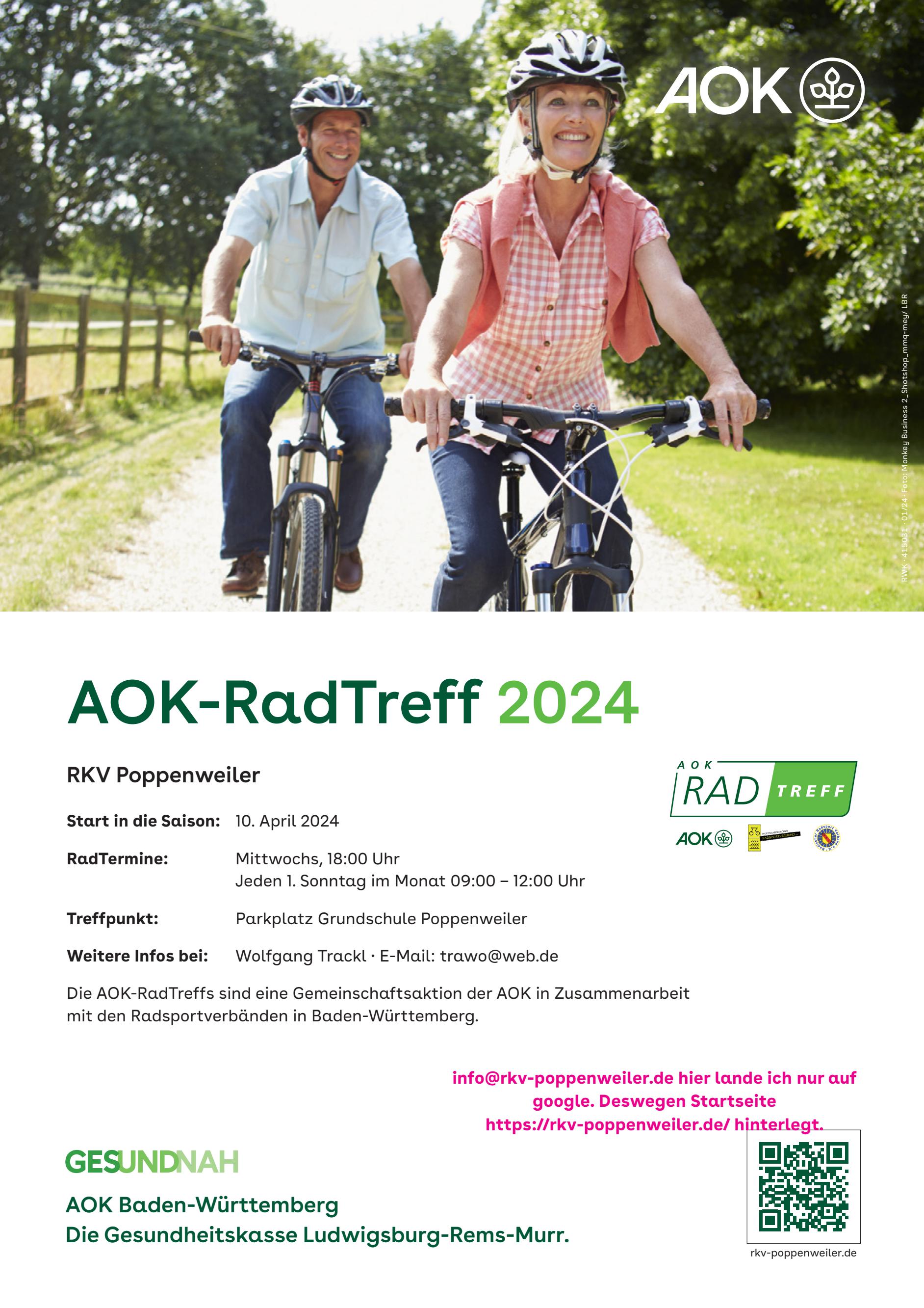 Am Sonntag, 15.06. richtet der RSC Komet die Bezirkswanderfahrt des Radsportbezirks Stuttgart aus. Die AOK-Radtreffler des RKV treffen sich dazu um 9.00 Uhr am Stüble. Dann fahren wir vermutlich in verschiedenen Gruppen los, so dass wir bis ca. 12.00 h oder 12.30 h am Ziel in Eglosheim ankommen. Dort kann man sich mit Essen und Getränken stärken. Dann werden die an diesem Tag gefahrenen Kilometer und die Teilnehmer multipliziert. Der Verein der dann am meisten Kilometer aufweisen kann erhält den Wanderpokal. Nach der Siegerehrung, die gegen 13 Uhr stattfindet, fahren wir – hoffentlich mit einem Pokal - wieder nach Poppenweiler zurück.