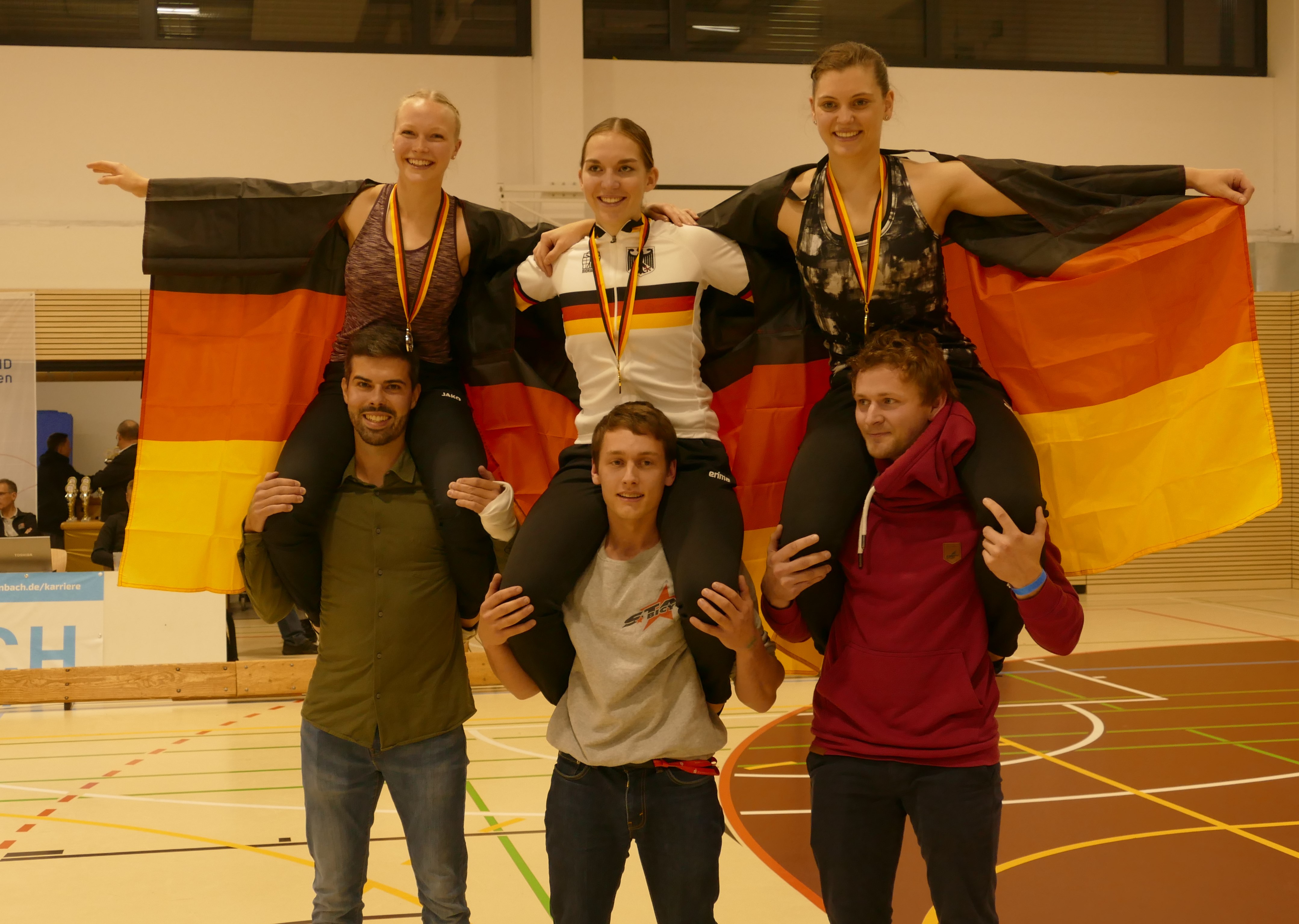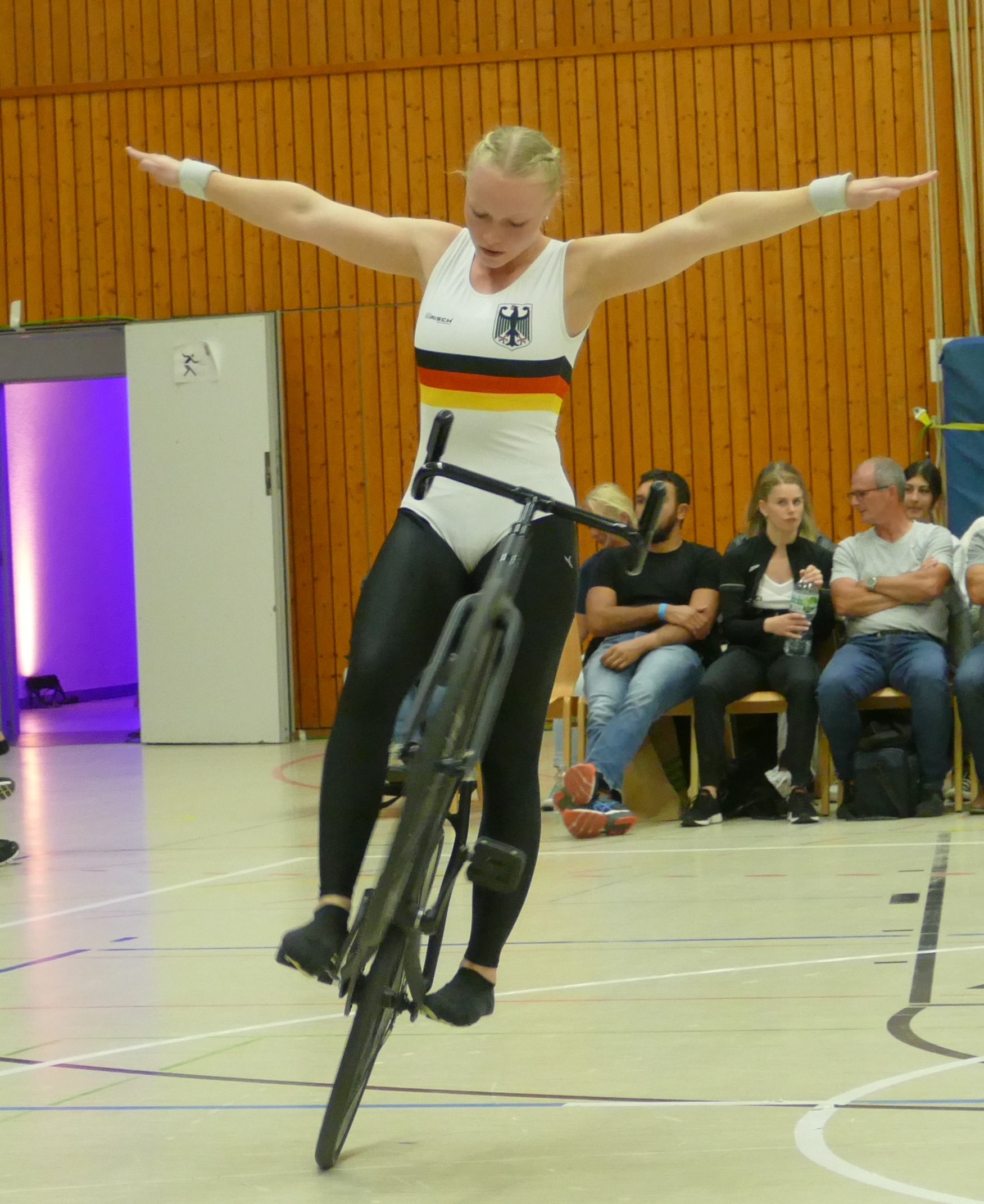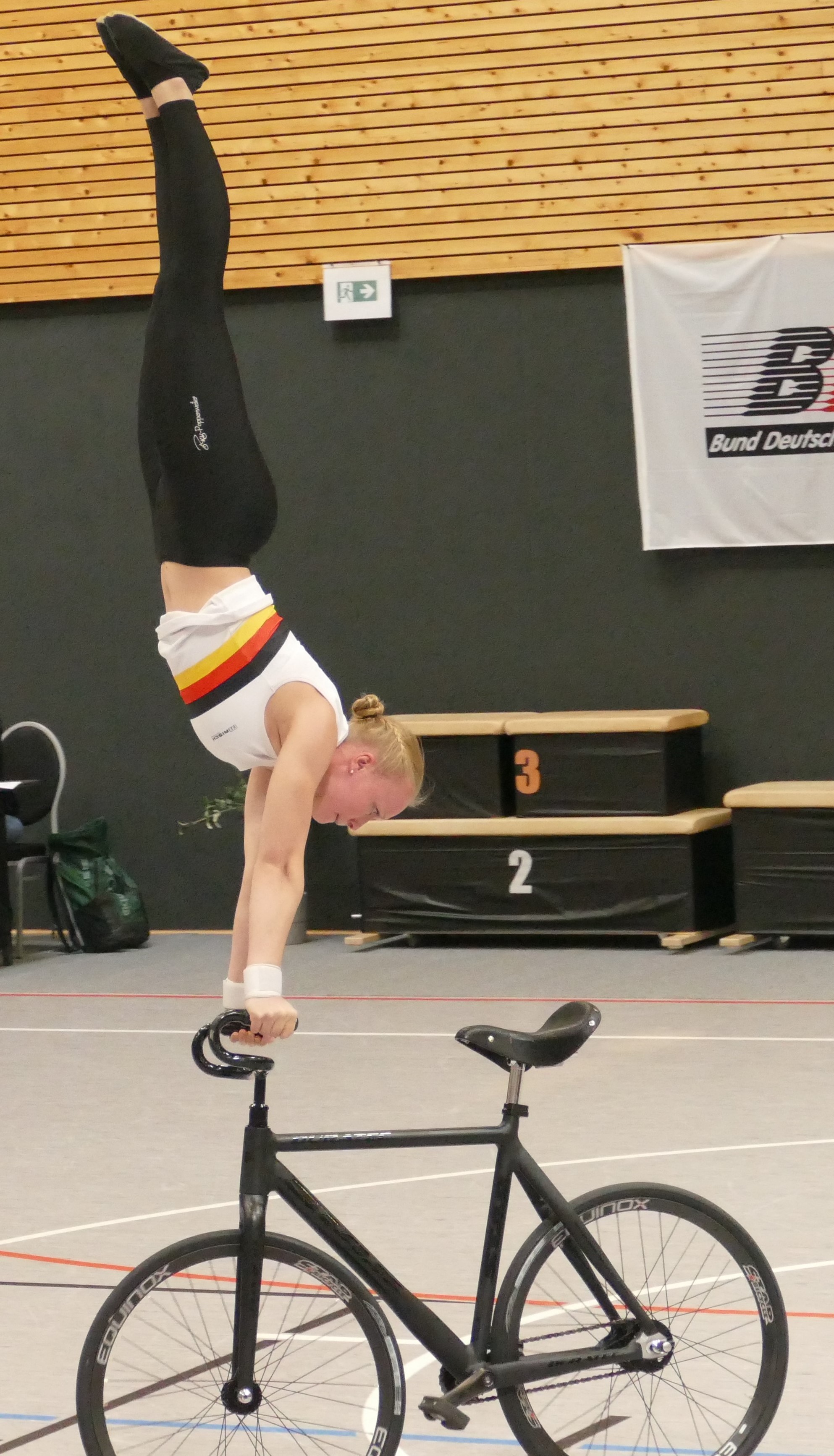 Das Publikum jubelte bereits beim Standsteiger rückwärts, der letzten Übung von Laras Füllers Kür bei den Deutschen Meisterschaften im Hallenradsport in Mainz. Dem war eine nahezu perfekte und wunderschön gefahrene Kür vorausgegangen, bei der es nur sehr wenig Grund zum Punktabzug gab.