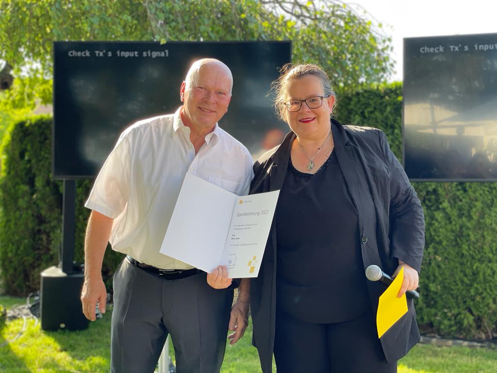 Renate Schmetz würdigte in einer Rede das außergewöhnliche Engagement von Maria Jacek und überreichte Paul Jacek stellvertretend die Urkunde der Sportlerehrung für 2021.