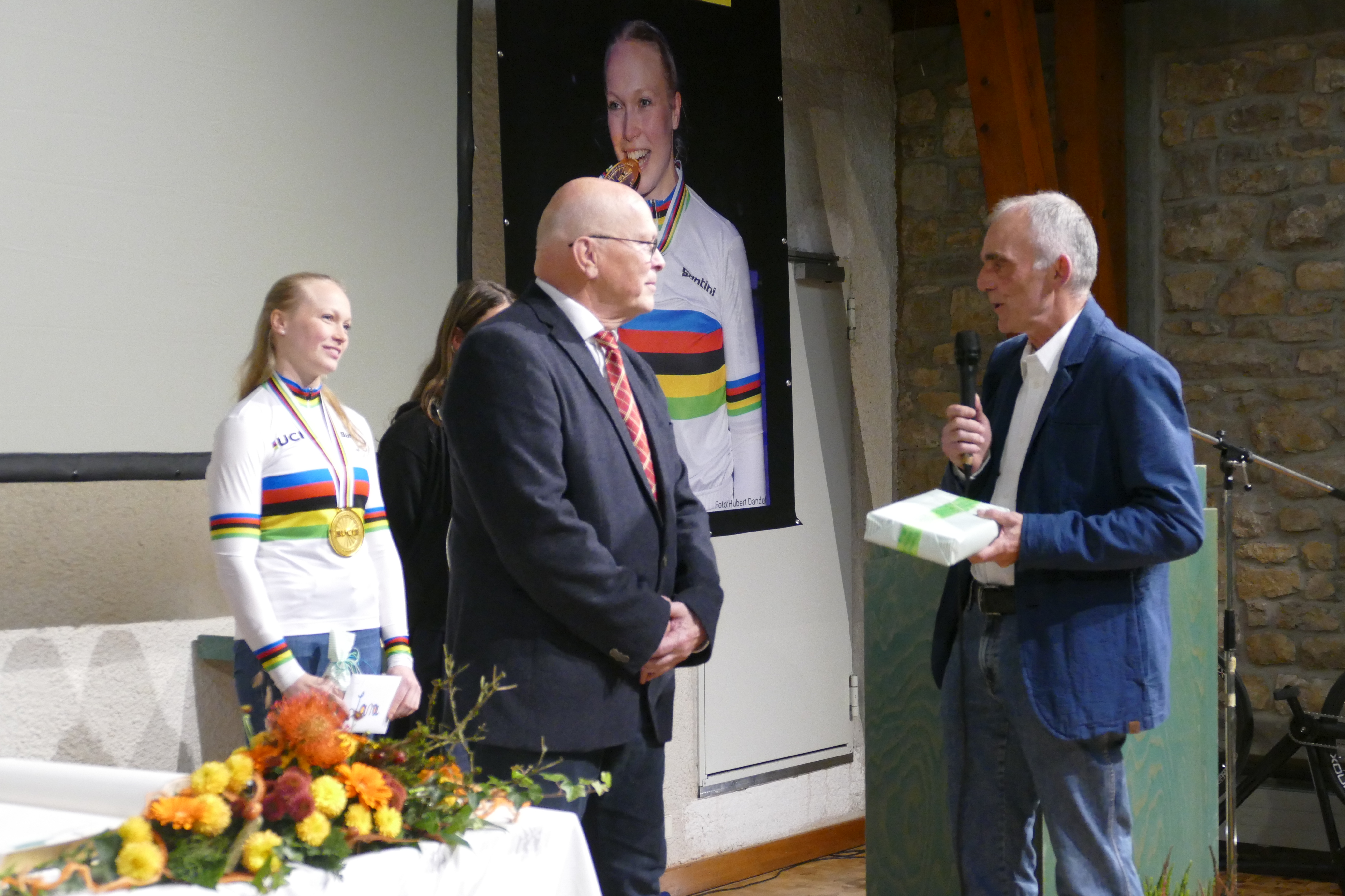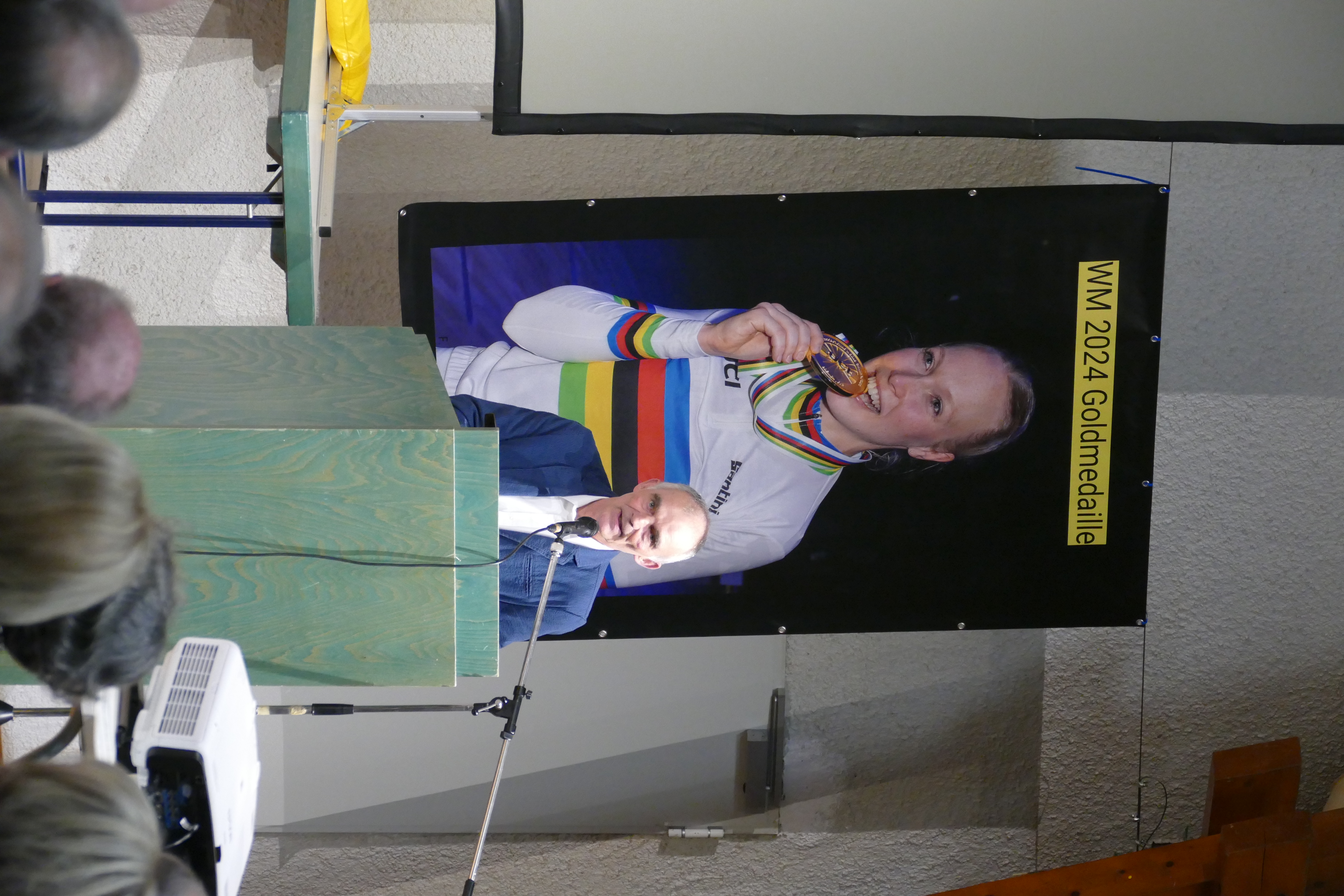 Dietmar Zeiher erinnerte er an die damals vierjährige Lara, die mit so viel Freude und Spaß das Kunstradtraining, geleitet von Maria und Paul Jacek, besuchte. Nach 21 Jahren nun der Weltmeistertitel als Höhepunkt ihrer Karriere. Dem vorausgegangen waren unter anderem zwei Vizeweltmeisterschaften, eine Vizeeuropameisterschaft sowie der fünfmalige Gewinn der Deutschen Meisterschaften. Anschließend durften die Besucherinnen und Besucher die Weltmeisterkür von Lara auf der Leinwand genießen.