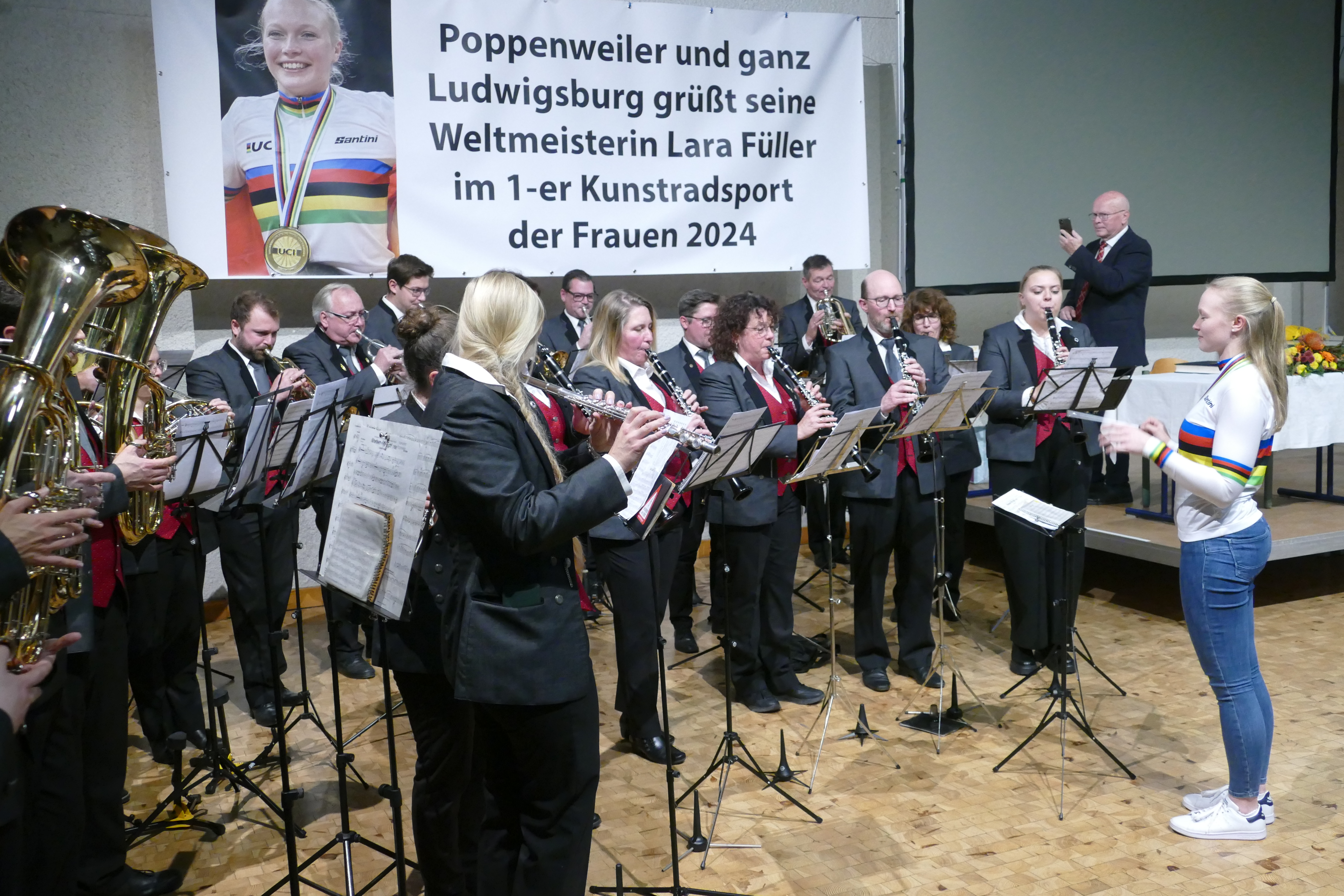 Nach herzlichen Gratulationen übermittelt durch Matthias Müller (Präsident Sportkreis Ludwigsburg), Peter Sutschek (1.Vorsitzender Radsportbezirk Stuttgart), Klaus Maier (Präsident Württembergischer Radsportverband) und Hubert Dandl (Solidarität Bruckmühl) durfte Lara ihr Talent als Dirigentin zeigen und für den Musikverein Poppenweiler einen Marsch dirigieren. Im Anschluss wurde mit Sekt angestoßen und mit Leckereien vom vielfältigen Buffet kräftig gefeiert. Zur Feier stieß OB Matthias Knecht hinzu, um persönlich zu gratulieren.