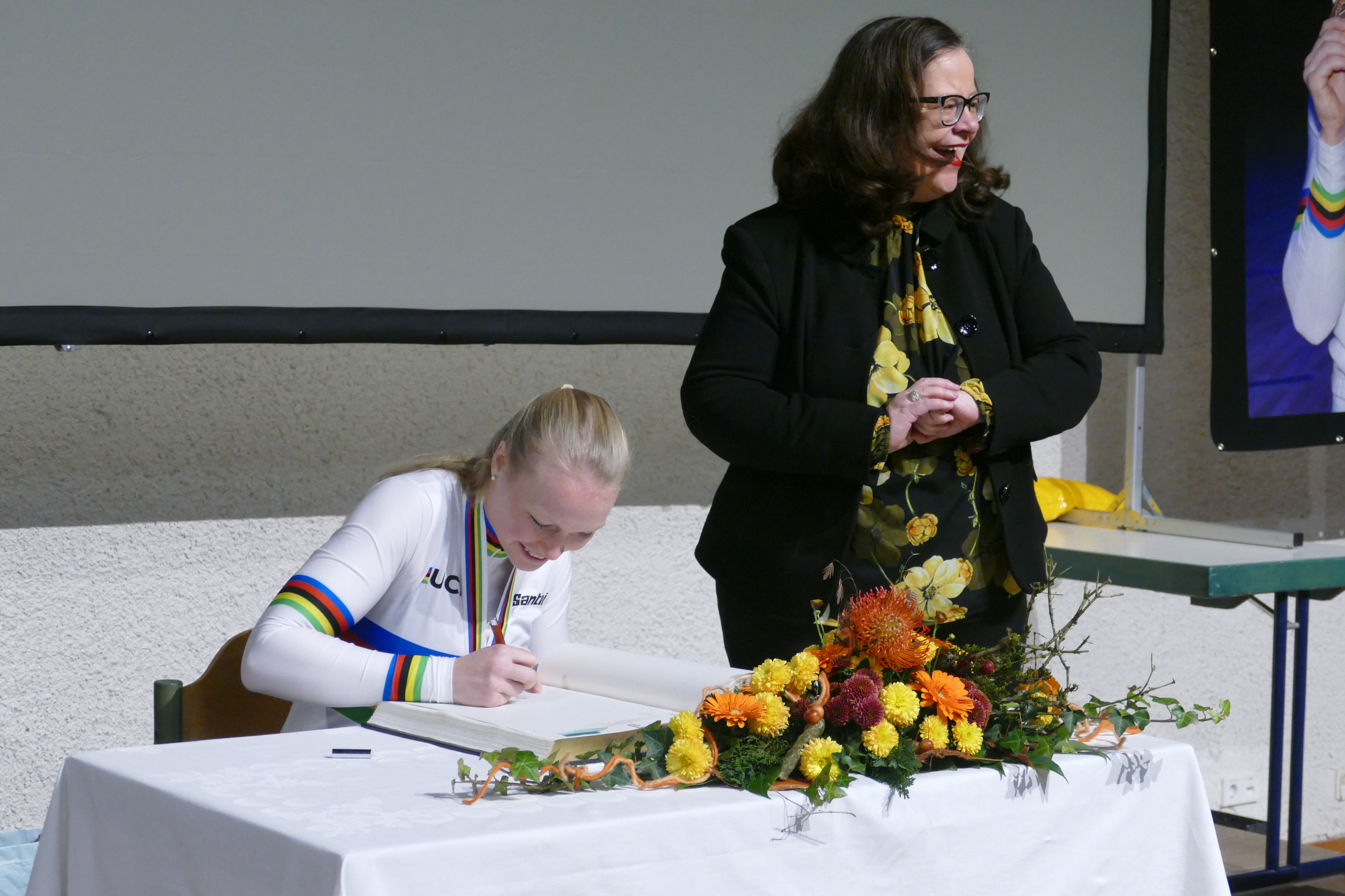 Bürgermeisterin Renate Schmetz betonte sowohl Laras Leistung als Sportlerin aber auch ihre Menschlichkeit und Authentizität bevor Lara die große Ehre erhielt, sich ins goldene Buch der Stadt Ludwigsburg eintragen zu dürfen.