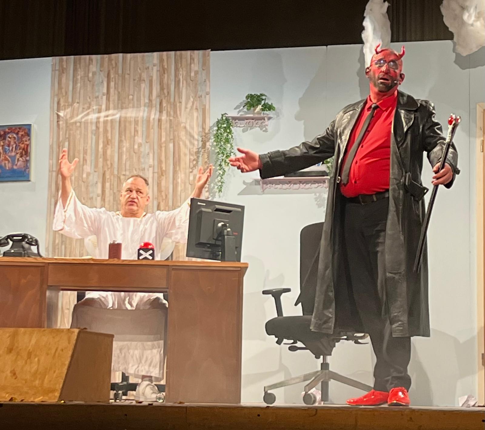 Perfekt in ihren Rollen vertreten spielten sich die Akteure schnell in die Herzen der Zuschauer. So musste Malermeister Wilhelm Holme (Réné Kucher) feststellen, dass das Jenseits auch nicht mehr das ist was es einmal war. Völlig überraschend trifft er vor dem jüngsten Gericht ein und muss sich mit Abteilungsleiterin Gisela Geigenbläser (Christel Kanschat) und ihrem Wartenummernabreißspendergerät mit einer Flut von bürokratischem Unsinn auseinandersetzen. Für Verwirrung sorgt zudem Praktikantin Alina Alessi (Tina Potschatka) die mit Ihrer schusseligen und naiven Art kein Fettnäpfchen auslässt, und die, die von Angi Fuchs gespielte Leiterin des Beschwerdemanagements Frau Möckel-Biedermann, auf Trab hält. Auf den Leib geschneidert wurde allem Augenschein nach Patrick Gorba die Rolle des Erzengels Philippus. Gekonnt spielt er den genervten Erzengel, welcher sich nicht nur um die Probleme seines eigenen Personals kümmern muss, sondern an der Himmelspforte auch noch Werbung für das Himmelreich machen soll. Ob veganes Manna von lokalen Anbietern oder ein Casting für den Engelschor, ihm bleibt nichts erspart. Während sich Isolde schon auf die angepriesene Lounge im Himmelreich freut erscheint zu allem Überfluss auch noch Luzifer, der Fürst der Finsternis (Tobias Kutschera), welcher nach einem Bad in Frischabfällen nicht nur die Geruchsnerven der Anwesenden reizt, sondern auch noch unter einem Burnout leidet. Unterdessen stellt sich für Wilhelm Holme die Frage „Himmel oder Hölle“ nachdem seine kühn geschaffene Frau Luise (Elke Zeiher) einen Antrag auf Versetzung in die Hölle für ihn gestellt hat. Mit Pflichtverteidiger Dr.Sommer (Alex Hahn), welcher zugleich als Holmes Hausarzt fungiert, ist Wilhelm Holme nicht wirklich glücklich und so endet die Verhandlung zwischen ihm und Luise´s Anwältin, Veronika von Wertheim (Pascale Könning) für ihn in völliger Verzweiflung. „Gefühle in der Ehe bauen sich ab wie Alkohol“ – nach dieser Feststellung von Veronika von Wertheim glaubt niemand mehr so wirklich an glückliche Ehen, und doch wendet sich das Blatt. So findet am Ende doch alles ein gutes Ende und Erzengel Philipus ermutigt Luzifer, im Poppenweiler Publikum doch Werbung die Hölle zu machen. Der ein oder andere wird schon dabei sein!